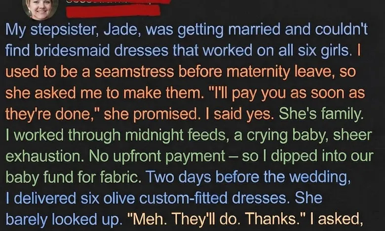 When my stepsister Jade called to ask if I could sew six custom bridesmaid dresses for her upcoming wedding, I hesitated but agreed, hoping the project might bring us closer. With a newborn at home and our savings stretched thin, the extra income would have helped. Still, I used $400 from our baby fund to purchase fabric, lining, and all the materials needed. Over the next three weeks, I cared for my son in between fittings, adjusted designs to suit each bridesmaid’s needs, and worked late into the night. By the time the dresses were finished, they looked like they belonged in a professional showroom. When I delivered them, however, Jade brushed off my effort and insisted the dresses were simply my “gift,” despite promising to pay for both materials and labor. Her casual dismissal left me feeling unappreciated and deeply disappointed.