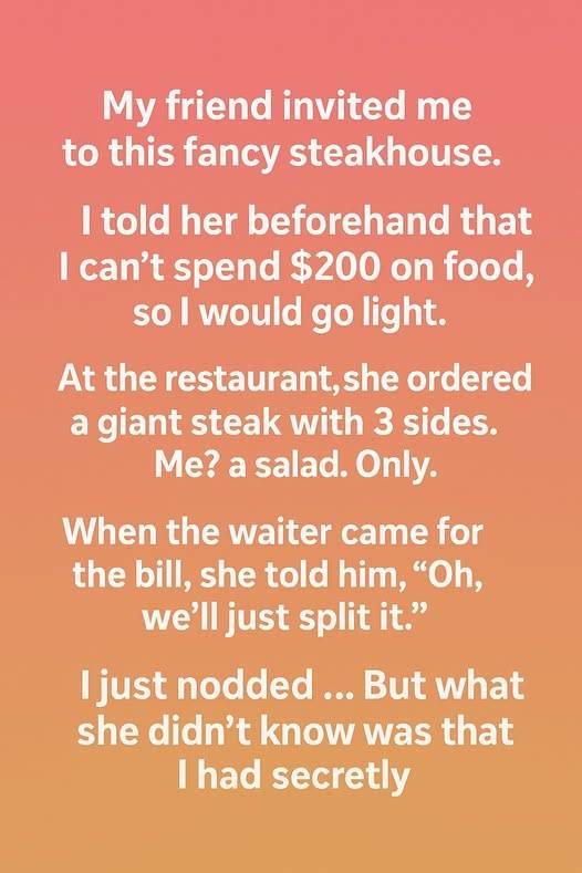 My friend invited me to this fancy steakhouse. I told her beforehand that I can’t spend $200 on food, so I would go light. At the restaurant, she ordered a giant steak with 3 sides. Me? a salad. Only. When the waiter came for the bill, she told him, “Oh, we’ll just split it.” I just nodded … But what she didn’t know was that I had secretly planned ahead. I had called the restaurant earlier that day and asked if I could pay only for my meal in advance. They happily agreed and prepared a separate check for me. So when the time came, I simply smiled and waited as the waiter placed two bills on the table — one for her meal, and one showing my salad was already paid for.