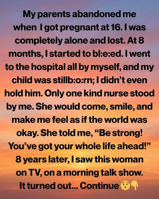 My parents abandoned me when I got pregnant at 16. I was completely alone and lost. At 8 months, I started to bl:e:ed. I went to the hospital all by myself, and my child was stillb:o:rn; I didn’t even hold him. Only one kind nurse stood by me. She would come, smile, and make me feel as if the world was okay. She told me, “Be strong! You’ve got your whole life ahead!” 8 years later, I saw this woman on TV, on a morning talk show. It turned out…that she had become a well-known advocate for young mothers and families in crisis. Seeing her on screen brought back memories I had tucked away for years. At that moment, I remembered how her gentle words had carried me through the loneliest chapter of my life. After losing my child and feeling abandoned, her kindness became a turning point. She never made me feel judged or broken—only supported. Her encouragement pushed me to continue school, find a part-time job, and slowly build a life where hope had once disappeared. Even though I never knew her name back then, her compassion stayed with me like a quiet light guiding my steps forward.