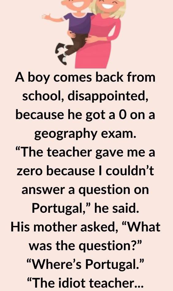 A boy comes back from school, disappointed, because he got a 0 on a geography exam.