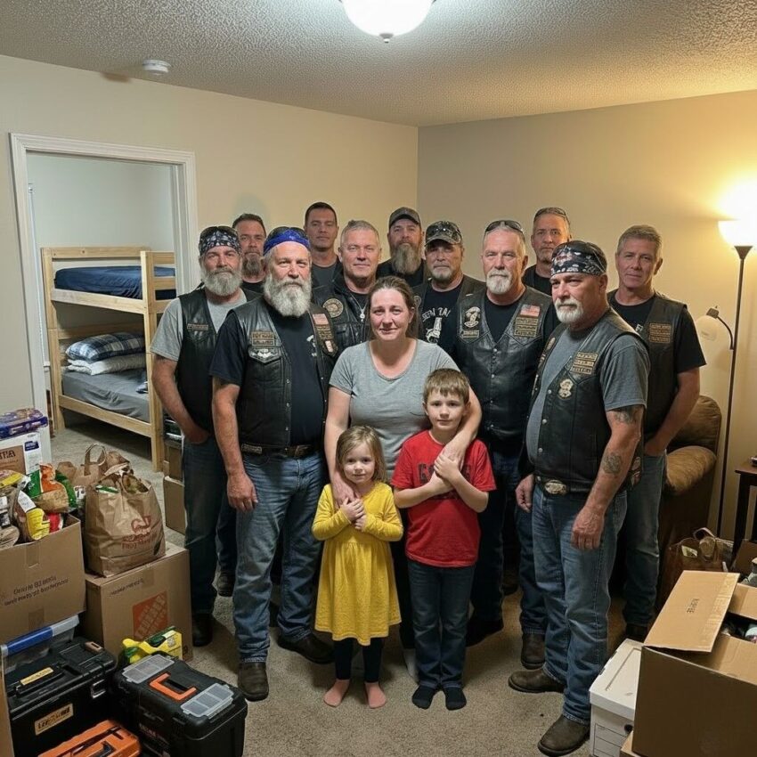 What followed still feels unreal, even months later. The bikers didn’t leave after the check was written and the threat was gone. Instead, they stayed. One man asked about my work experience and offered me a job with benefits starting immediately, no long application process, no waiting period. Others spread through the apartment, fixing things I had learned to ignore because I couldn’t afford repairs. A broken cabinet hinge was tightened, a leaky faucet was sealed, and the heater that had barely worked all winter was adjusted until warm air finally filled the rooms. Someone brought in boxes of groceries, filling my empty pantry and refrigerator with food my children hadn’t seen in weeks. Another biker took a look at my car in the parking lot, fixing a problem that had kept me worried every time I turned the key. They asked about my kids’ schedules and helped arrange after-school care so I could work without fear of leaving them alone. As they worked, they listened. They listened as I talked about my husband, about how we met, about the plans we made and the future that disappeared overnight. They listened without rushing me, without pity, without trying to fix grief that couldn’t be fixed. For the first time since my husband’s death, I felt truly seen.