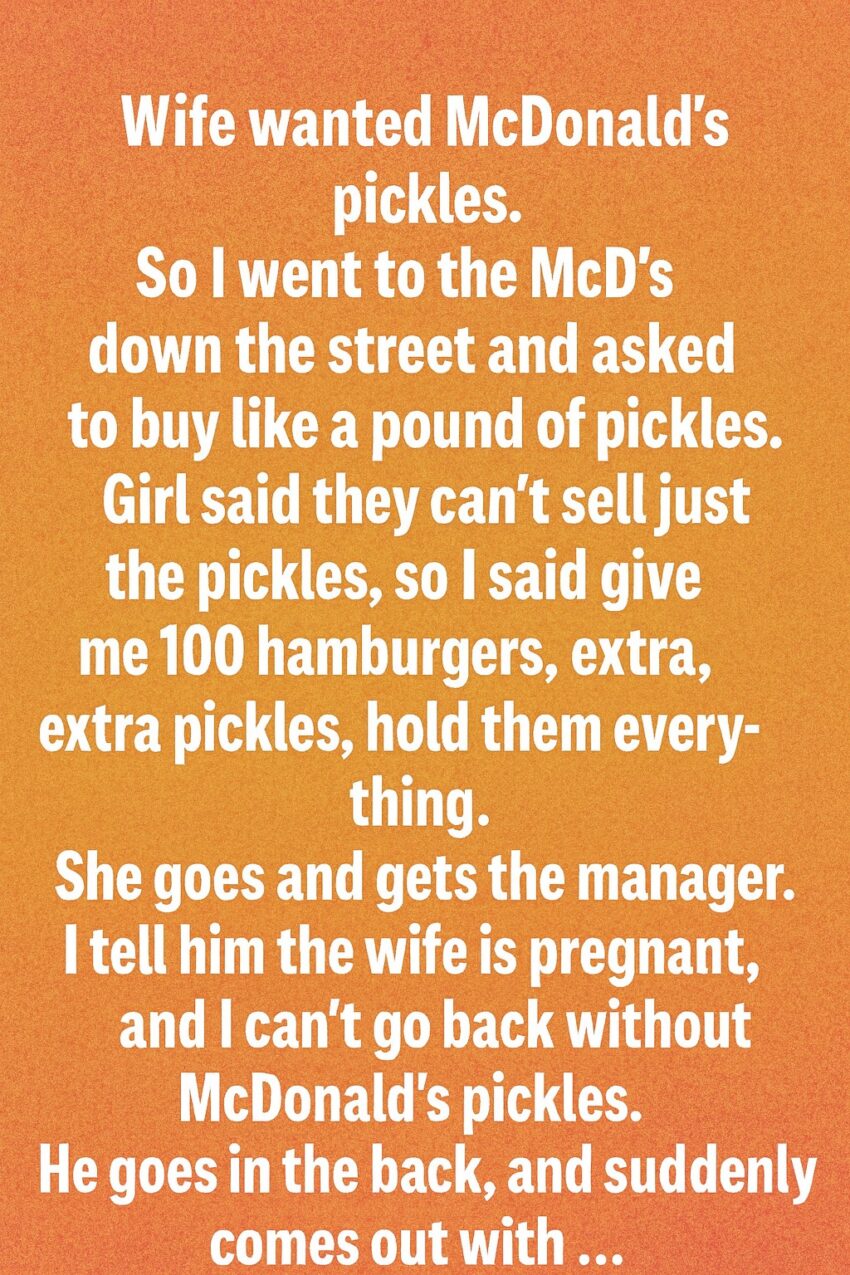 One evening, my wife had a sudden craving for McDonald’s pickles. Knowing how important it was to her, especially now that she was pregnant, I headed to the nearest McDonald’s hoping to buy just a container of pickles. When I asked the cashier, she politely explained that they couldn’t sell pickles on their own. I left, feeling a mix of frustration and determination—I didn’t want to go home empty-handed.
