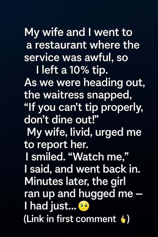 When the bill arrived, I left a modest tip—about 10 percent. As we stood to leave, she suddenly snapped, telling us not to dine out if we couldn’t tip properly. My wife stiffened immediately and whispered that we should ask for the manager. I paused, then said quietly, “Let me handle this,” and stepped back inside. When I asked to speak with the manager, the server froze, clearly expecting criticism. Instead, I explained that her mistakes didn’t seem careless, but human—like someone overwhelmed.