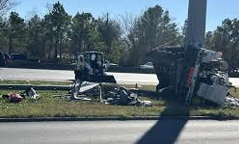 Following the collision, the trailer ended up positioned across the roadway, completely blocking all three north–south traffic lanes. Authorities implemented a partial closure of the highway while emergency crews responded to the scene and worked to clear the vehicles.