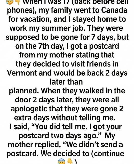 I was seventeen, old enough to taste freedom but still young enough to fear the quiet. The summer my family left for Canada without me, our house felt larger than it ever had—rooms echoing, clocks ticking too loudly, and nights stretching thin. They were supposed to be gone seven days. I worked mornings at a grocery store, came home to microwave dinners, and slept with the radio on for company. On the seventh day, a postcard arrived. It was addressed in my mother’s handwriting, cheerful and looping. She wrote that they had decided to stop in Vermont to visit friends and would return two days later than planned. I remember feeling oddly relieved, like the house itself had exhaled.
