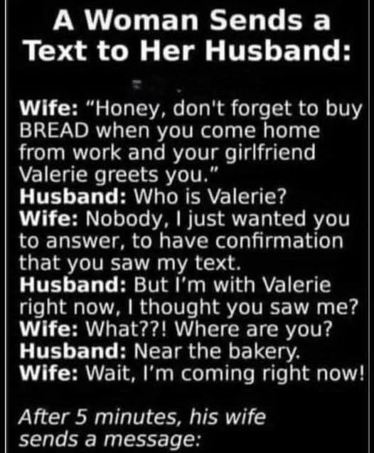 Sometimes the simplest request can unravel into a story you end up telling for years. What began as a harmless reminder quickly turned into a lesson in panic, mischief, and the strange way humor can hold a marriage together. Knowing her husband often skimmed texts, the wife decided to be clever. She sent a message reminding him to buy bread, casually adding, “when you come home from work and your girlfriend Valerie greets you.” She smiled, confident the name would catch his attention.