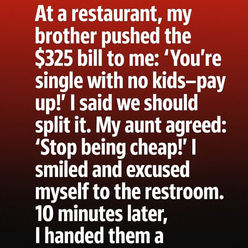Dinner had started off light and cheerful—jokes flying, glasses clinking, the kind of laughter that fills a restaurant and makes time feel unimportant. But when the check arrived, the mood shifted. My brother slid the $325 bill toward me with a grin. “You’re single with no kids—come on, you can cover it,” he said, as if it were the most natural thing in the world. My aunt added, half-joking, “Don’t be cheap!” and a few others laughed. I smiled, not because it was funny, but because something clicked.