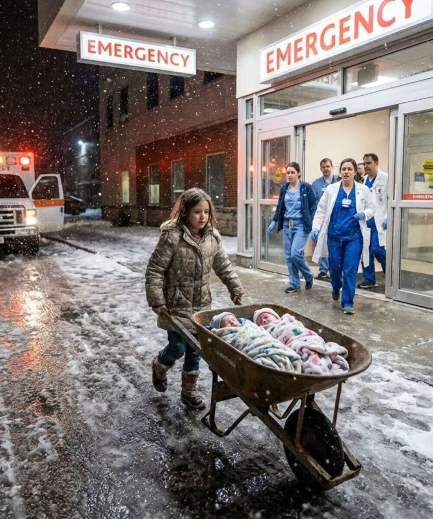 My mom hasn’t woken up for three days…” The words came out of the little girl’s throat raw and broken as she pushed an old, dented wheelbarrow down a cracked dirt road that stretched endlessly through dry fields and silence. Her name was Lucía Morales, and she was only seven years old. The handles of the wheelbarrow were rusted and jagged, biting into her small palms until blisters split open and her hands burned with every step, but she did not stop. Inside the wheelbarrow, wrapped in blankets that were never meant to protect such fragile bodies from the cold dawn air, lay her newborn twin brothers, Mateo and Samuel. They were not sleeping peacefully the way babies in picture books do. They were fighting—each shallow breath a quiet struggle, each faint sound a reminder that time was slipping away. Their home was miles from the nearest town, isolated among fields where nothing grew easily. A year earlier, their father had been killed in a workplace accident, leaving Lucía and her mother, Carmen, alone to survive on temporary jobs and hope. Hunger had become a familiar companion, fear an unspoken constant. Carmen had gone into labor alone, without a doctor, without a midwife, without anyone. Two days after giving birth, burning with fever and shaking uncontrollably, she collapsed onto the thin mattress they shared. Lucía waited for her to wake up. She waited through the night, through another long morning, whispering her name again and again. Her mother never opened her eyes. When the babies’ cries grew weaker and then frighteningly quiet, Lucía understood something no child ever should—that waiting was no longer an option.