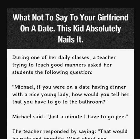 During one of her daily classes, a teacher trying to teach good manners asked her students the following question: “Michael, if you were on a date having dinner with a nice young lady, how would you tell her that you have to go to the bathroom?
