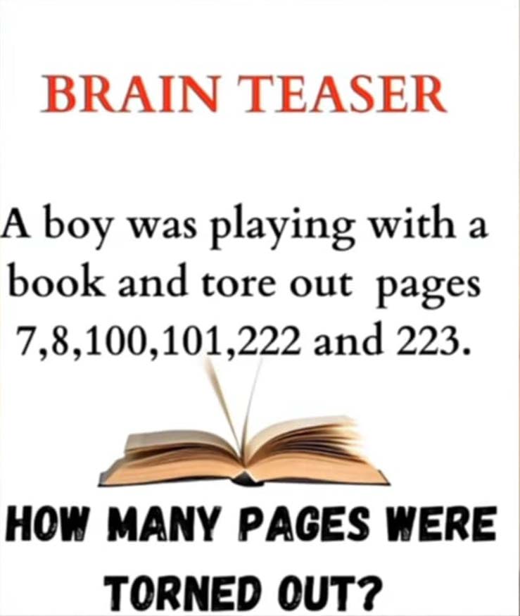 A boy was playing with a book and tore out the pages 7, 8, 100, 101, 222 and 223. How many pages were torned out?