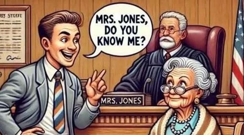 The lawyer was stunned. Not knowing what else to do, he pointed across the room and asked, “Mrs Jones, do you know the defence attorney?”