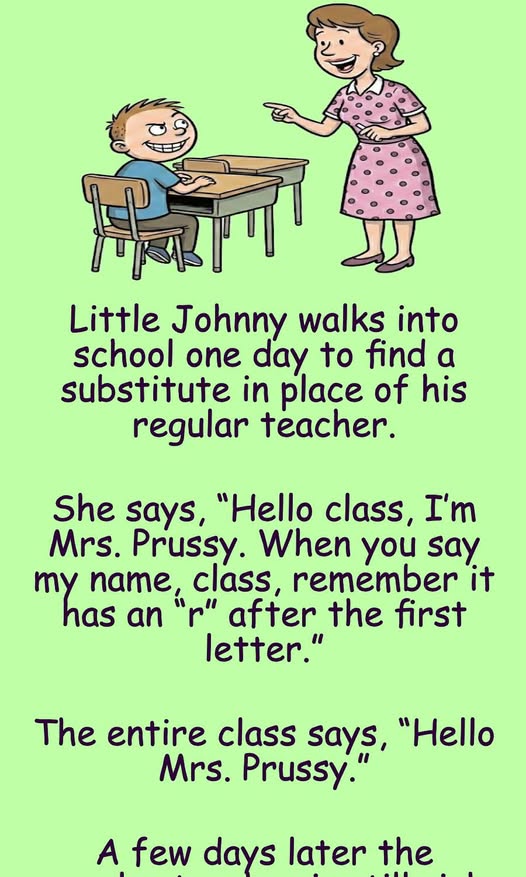 A few days later the regular teacher is still sick when Little Johnny gets to his desk the teacher asks what her name is.