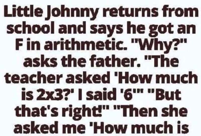 Johnny began explaining the situation in his straightforward way, recounting the class almost word for word. He said that during the lesson, the teacher had asked a simple question in front of everyone: “What’s three times two?” Johnny remembered the moment clearly. He had felt a small surge of confidence because this was something he knew. He raised his hand, answered “six,” and felt relieved when the teacher nodded. For once, he was certain he had done exactly what was expected. Hearing this, Johnny’s father immediately relaxed a little. Six was unquestionably the correct answer. There was no ambiguity there, no trick or nuance. If Johnny had answered correctly, then why would he fail? His father nodded along, agreeing out loud that six was the right answer, and for a brief moment, both of them shared the assumption that there must be more to the story—something Johnny hadn’t mentioned yet that would explain the failing grade. Perhaps the test had included more questions, or perhaps Johnny had misunderstood which assignment the grade applied to. The idea that a correct answer could lead directly to an F simply didn’t make sense, and Johnny’s father was confident that once all the facts were laid out, the situation would be easily resolved.