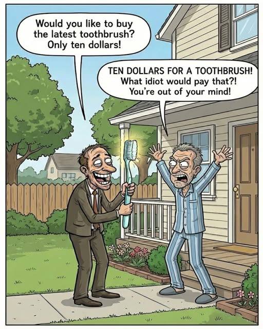 “Ten dollars for a toothbrush!” shouts the man. “What idiot would pay ten dollars for a toothbrush? You’re out of your mind.”