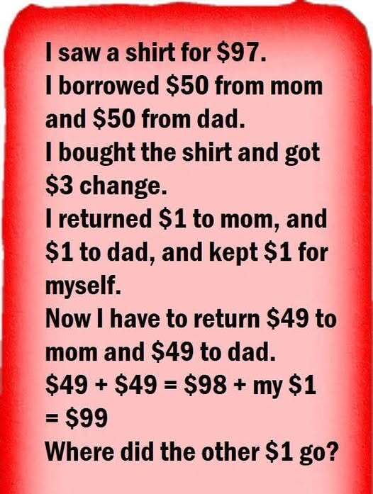 Now, the puzzle says $49 + $49 = $98, and then adds that $1 you kept, bringing the total to $99. Hold up! You’re wondering: where’s that last dollar?
