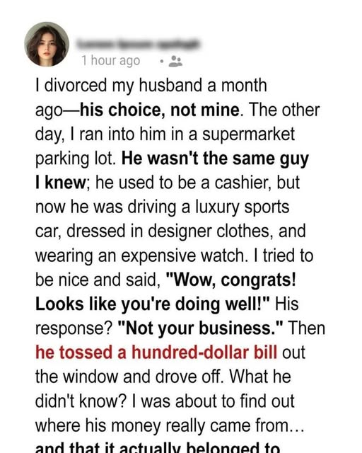 Katherine’s quiet life took a sharp turn the day she spotted a pristine white sports car in a supermarket parking lot — and out stepped Michael, her ex-husband. Once a modest grocery store cashier, he was now dressed in designer clothes, wearing a luxury watch, and exuding arrogance. Their divorce had been finalized just a month earlier, shortly after her grandfather passed away.
