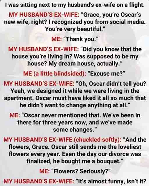“Thank you,” I replied, my voice thinner than I intended. It hit me then: this was the woman my husband once vowed to spend his entire life with. Sitting next to her felt like sharing a row with a ghost—a piece of his past I never expected to meet, much less be trapped beside for the next three hours.