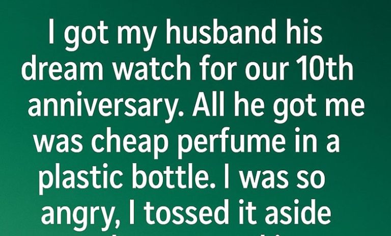 I got my husband his dream watch for our 10th anniversary. All he got me was cheap perfume in a plastic bottle. I was so angry, I tossed it aside and never used it. This was our last celebration because he died unexpectedly three weeks later. The pain of losing him was unbearable—I replayed that night over and over, angry not at the gift anymore, but at myself for letting disappointment overshadow love. I missed his voice, his laugh, even the way he reminded me to drink water when I got too busy.