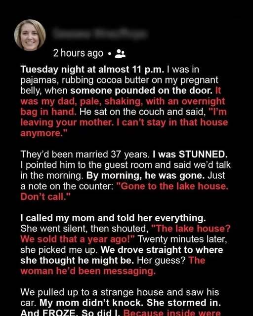 She was shocked, revealing she’d seen suspicious messages from a woman named Lauren, who worked with Dad. Fear and confusion filled me. Pregnant and worried, Mom and I went to Lauren’s house.