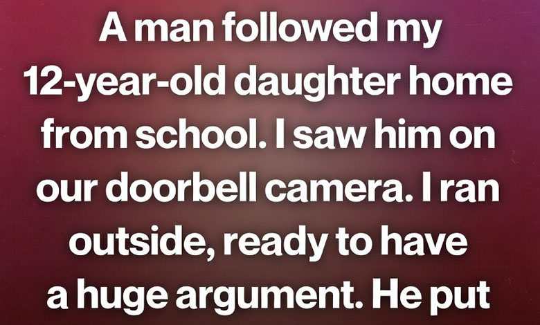 Late one afternoon, my 12-year-old daughter walked home from school the same way she always did—down the quiet neighborhood street lined with small trees and familiar houses. I was inside finishing a few chores when my phone buzzed with a motion alert from our doorbell camera. Curious, I opened the app and saw her walking toward the house. But a few steps behind her was a man I didn’t recognize. My heart began to race. I hurried outside, ready to confront him, my mind filled with protective worry.