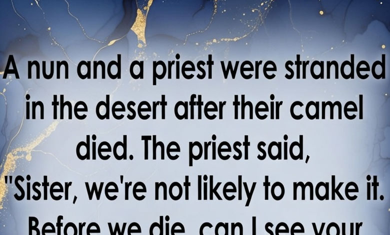 A nun and a priest found themselves stranded in the desert after their camel passed away. The priest, sensing the gravity of the moment, looked at the nun and said, “Sister, it seems we may not survive this.” “Can I see your chest before we die?”