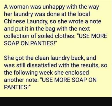 A woman was unhappy with the way her laundry was done at the local Chinese Laundry, so she wrote a note and put it in the bag with the next collection of soiled clothes: “USE MORE SOAP ON PANTIES!”