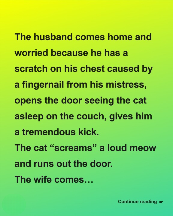The husband came home, panicked over a scratch on his chest from his mistress’s fingernail. Spotting the cat napping on the couch, he kicked it hard.